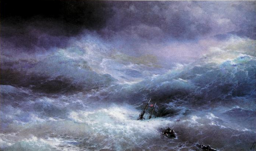 An early success for Ivan Aivazovsky was The Ninth Wave (shown in the header for this Mastodon account), which depicts an apocalyptic vision of the final flood, with stormy seas and lightning-split sky, overwhelming the remnants of mankind on the surface. In 1889's The Wave, he captures the vastness and isolation of what he described in a poem as "The great heaving ocean, striving with agitation and longing for the distant shore." - Eric Zafran