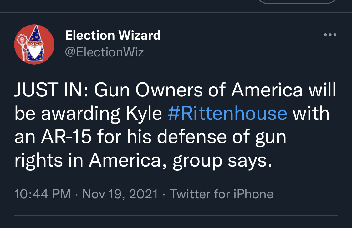 “JUST IN: Gun Owners of America will be awarding Kyle #Rittenhouse with an AR-15 for his defense of gun rights in America, group says.”