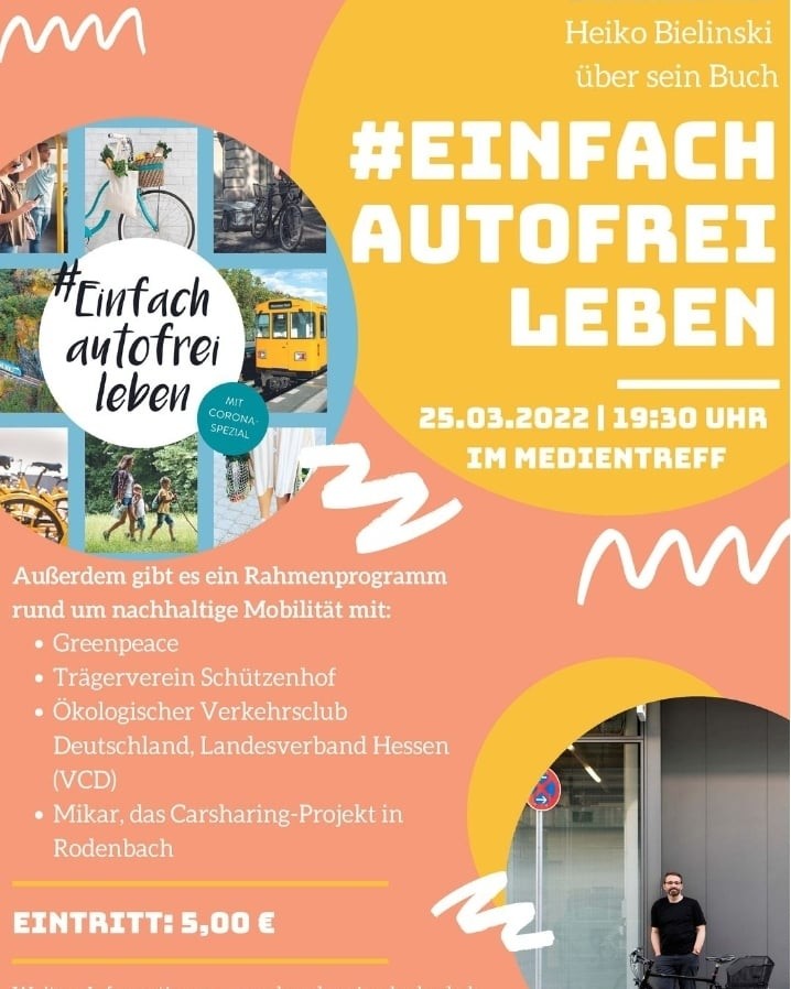 #einfachautofreileben Bei der Lesung in #Rodenbach am Freitag, 25. März 22, 19.30 Uhr (5 Euro Eintritt) stellen wir auch die Arbeit des @VCDeV vor und sammeln Unterschriften für @VerkehrswendeHE