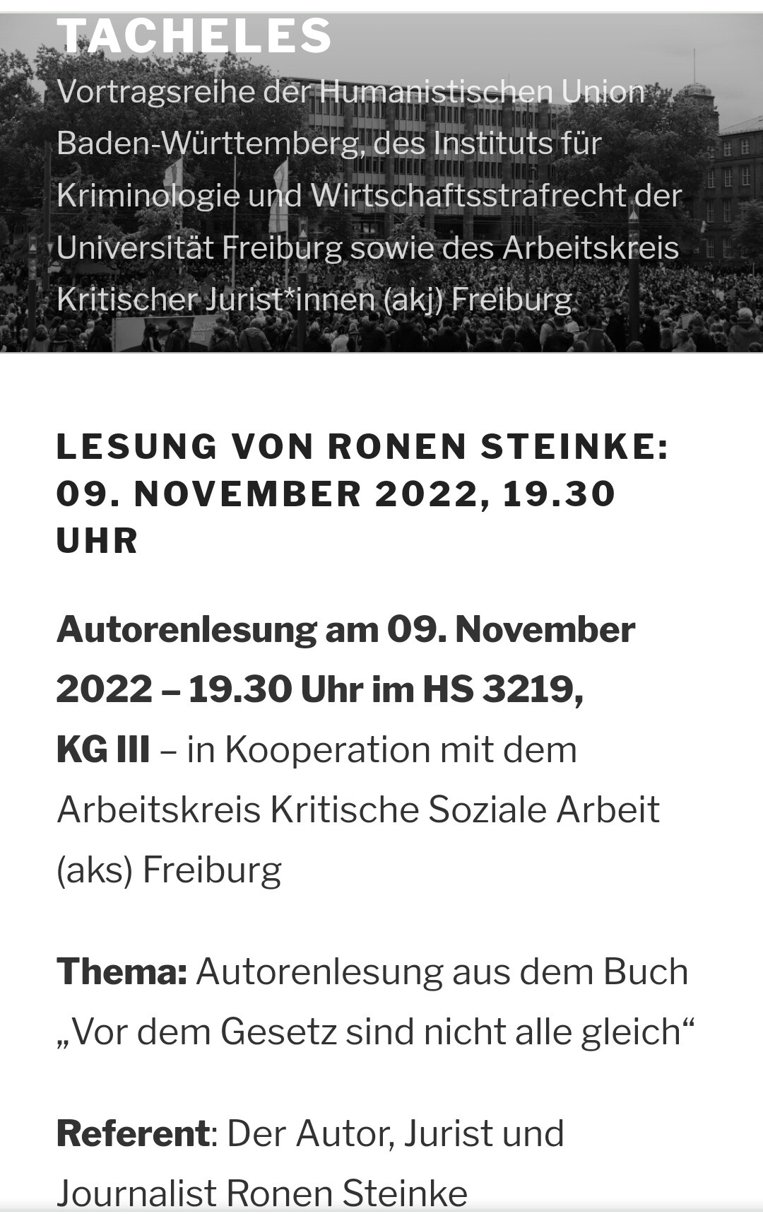 #veranstaltungstipp #RonenSteinke #freiburg #Armutsbestrafung #klassenjustiz #AKJFreiburg #HumanistischeUnion