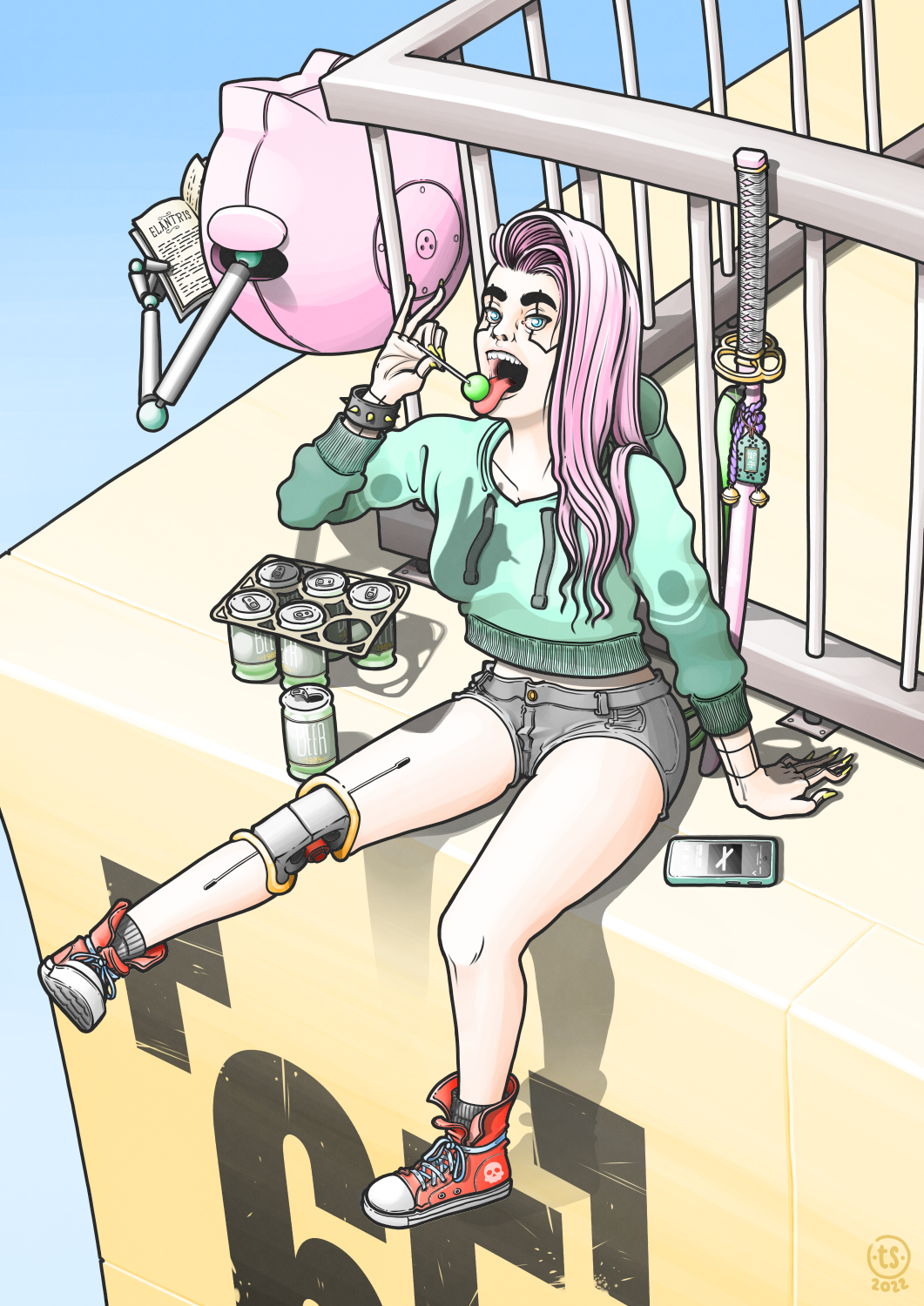 #digitalart #art #drawing #artwork #illustration #mastoart #robots #streetkids #characterdesign #cyberpunk #lollipop #beers #building #Rooftop #katana #book #reading #video #timelapse