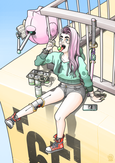 #digitalart #art #drawing #artwork #illustration #mastoart #robots #streetkids #characterdesign #cyberpunk #lollipop #beers #building #rooftop #katana #book #reading