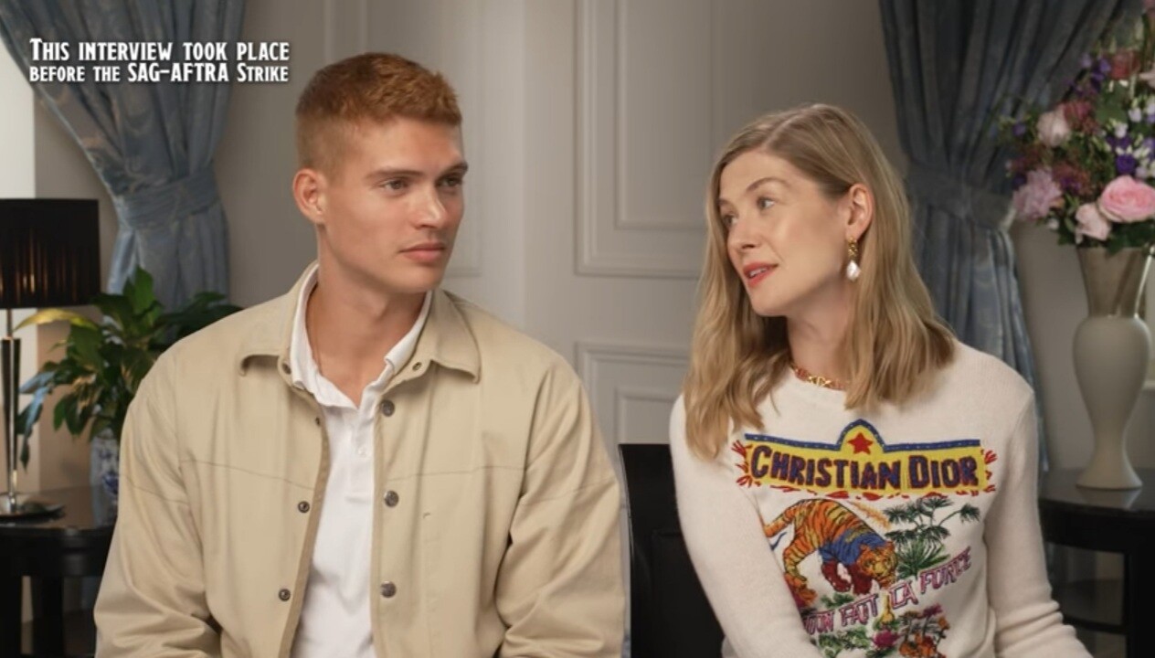 Rosamund in a Dior shirt, that says "L'union fait la force", in a promotional interview, recorded before the SAGAFTRA strike...