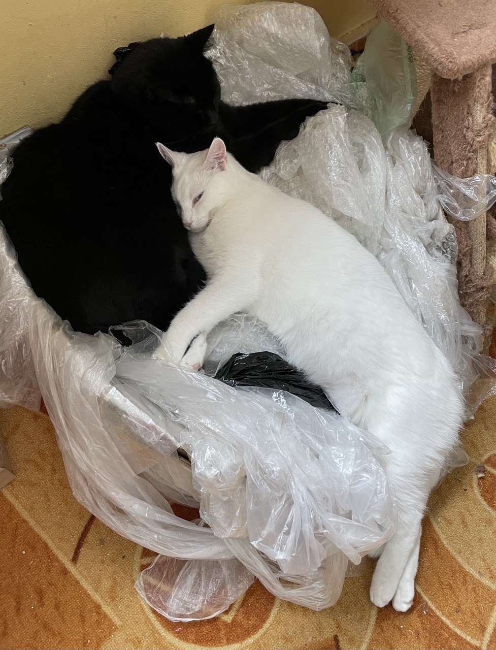 #Rosinka je typická ženská. Pana Černého si omotala kolem paciček a on ji zbožňuje 😻 olizuje jí uši, jenom ona smí k němu do šustivého pelíšku a použít ho jako polštář 😻