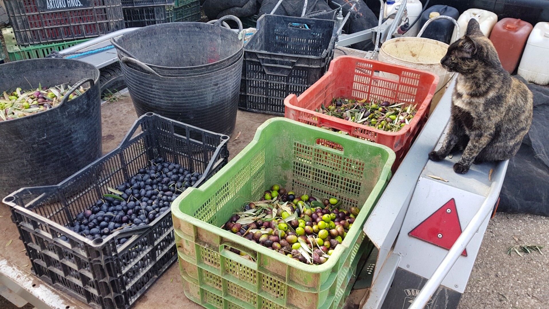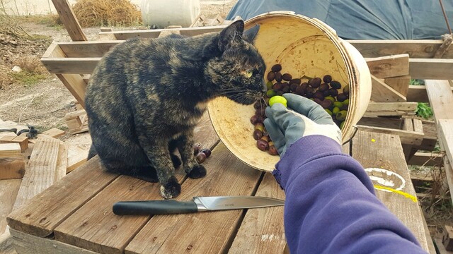 Today she's been overseeing my efforts at sorting out some of the olives we harvested over the last few days - the ones on the trailer are to be brined.