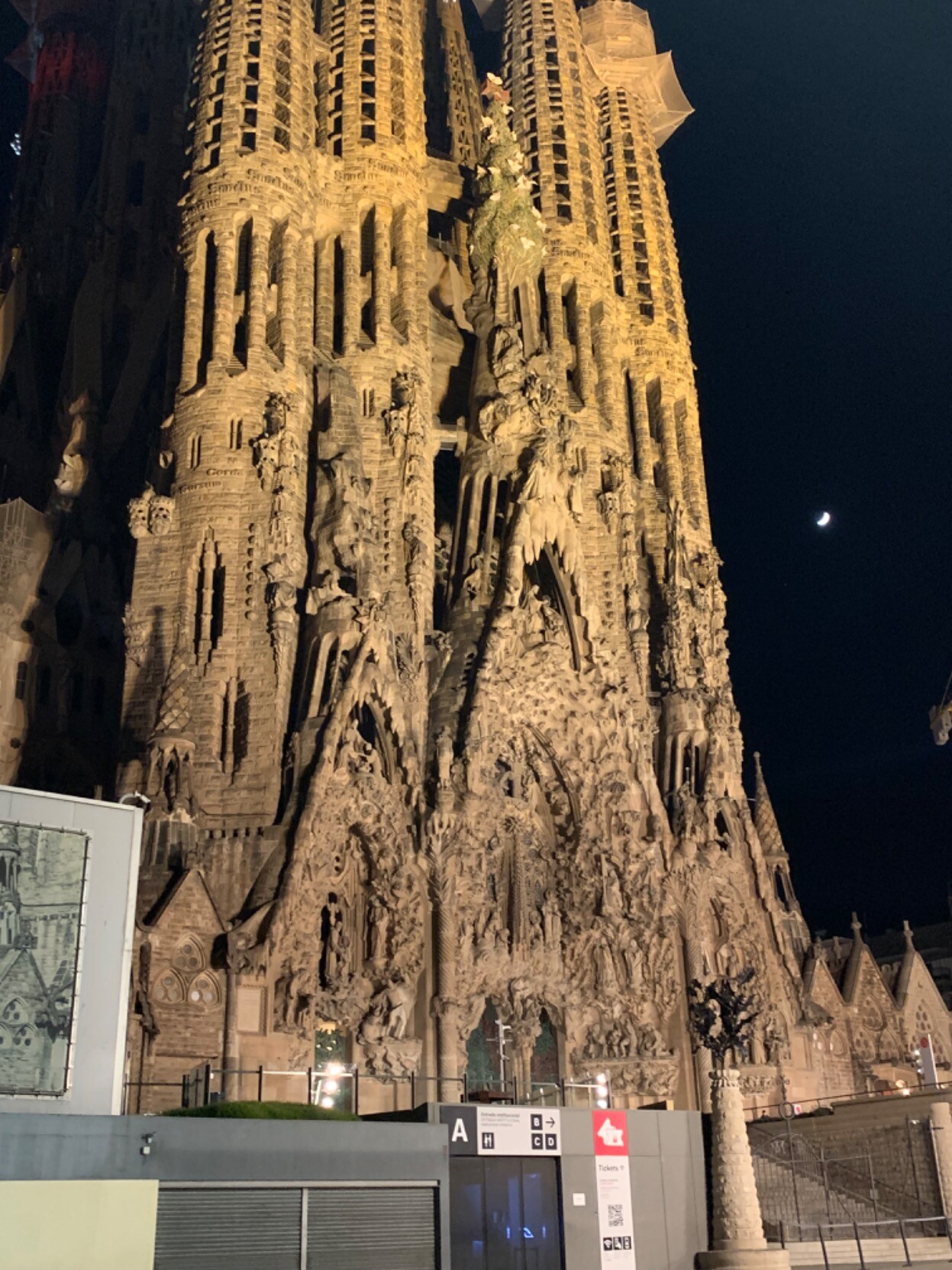 The «old» side of the #SagradaFamilia #Barcelona by night - with a crescent moon.
