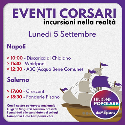 Ripartono gli eventi corsari. Stavolta siamo a #Napoli e #Salerno con il nostro portavoce @demagistris@twitter.com e i candidate e le candidate dei collegi locali.