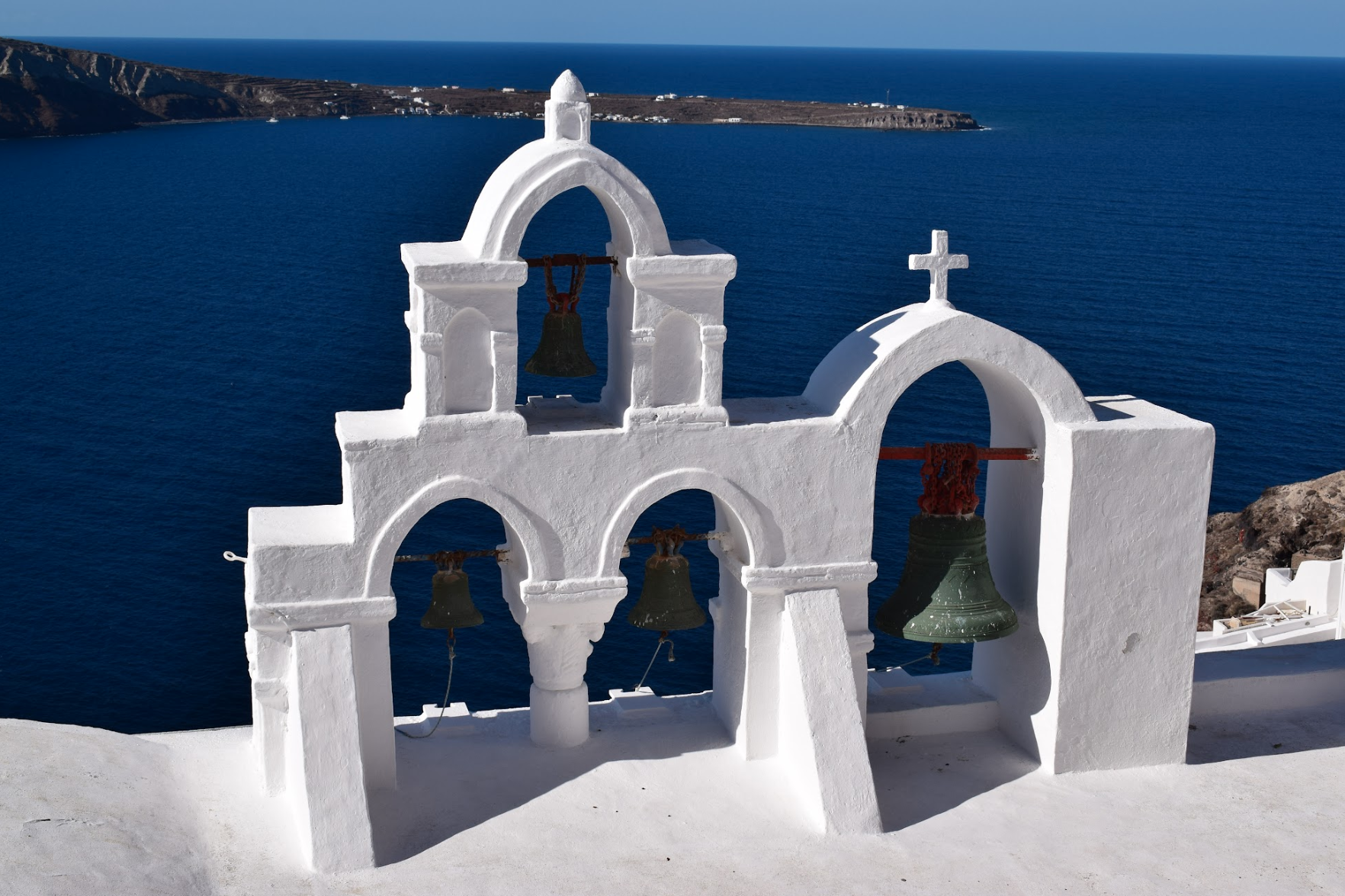 It's a view from the village of Imerovigli overlooking the caldera towards the islands of Nea Kameni and Therasia