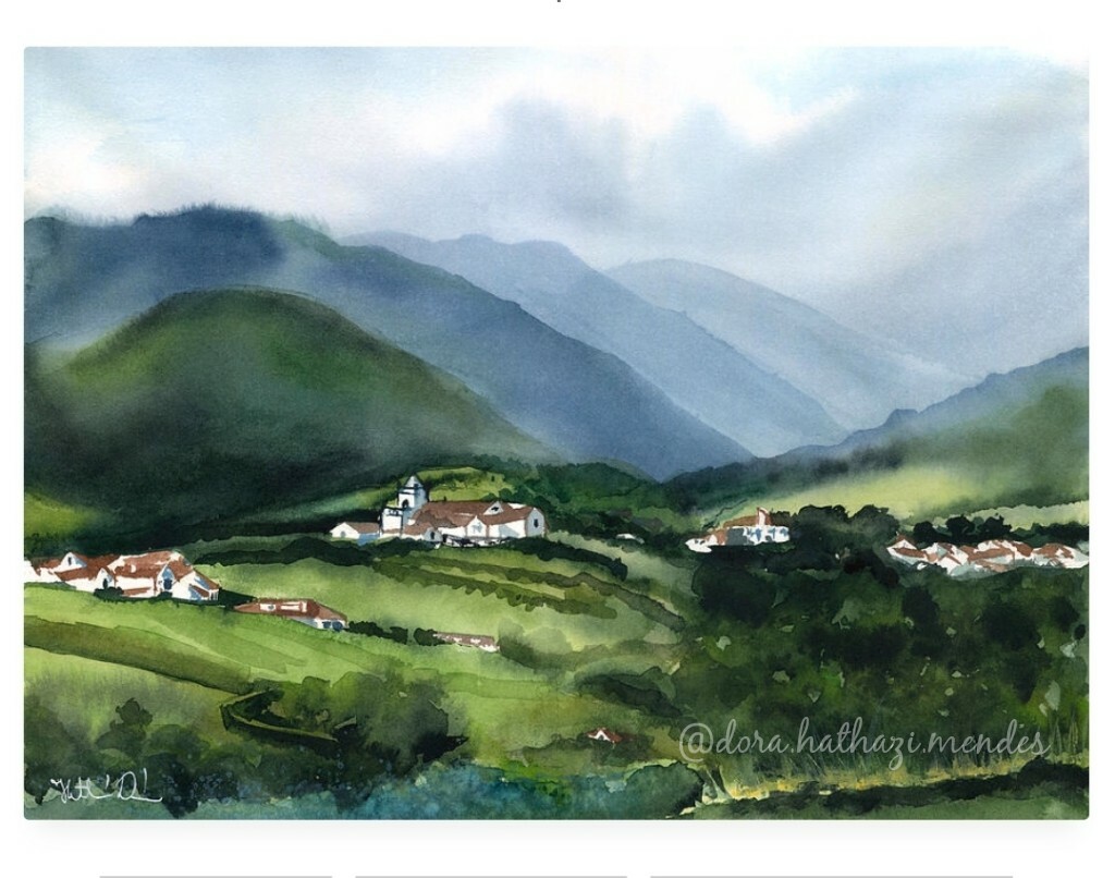 Misty Morning in São Miguel is the title of this watercolor painting about a beautiful view of a valley in Povoação Azores, Portugal, with the ridge Lomba do Loução and the Church of Nossa Senhora dos Remedios in the background 🇵🇹