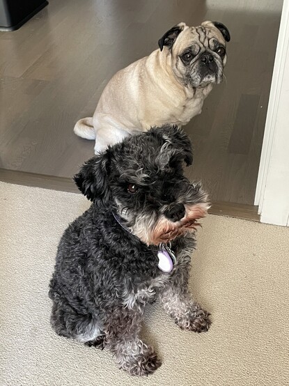 As is custom, the schnauzer is looking very serious and the pug is looking very concerned.