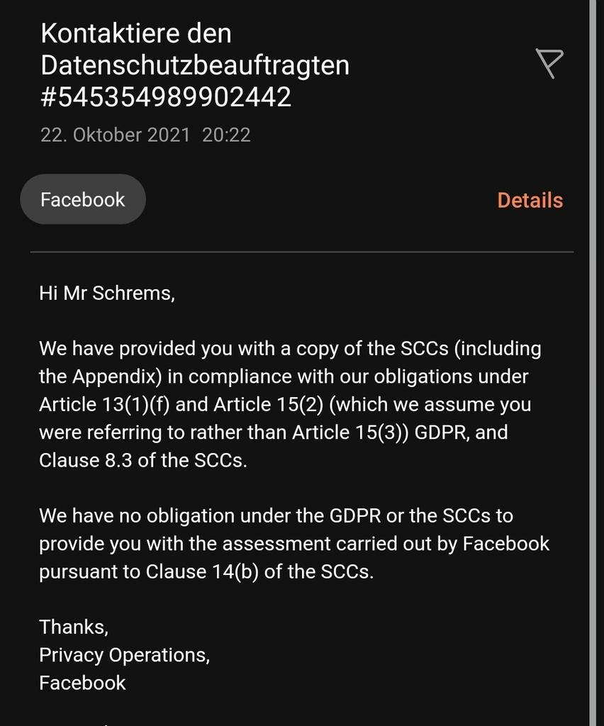 "Quindi Facebook continua i trasferimenti di dati negli Stati Uniti nonostante #SchremsI e #SchremsII basati su una "Valutazione dell'impatto del trasferimento" e gli SCC, ma se vuoi una copia di questa base legale, negano l'accesso, nonostante l'articolo 13 (1) (f ) e 15(2) #GDPR."