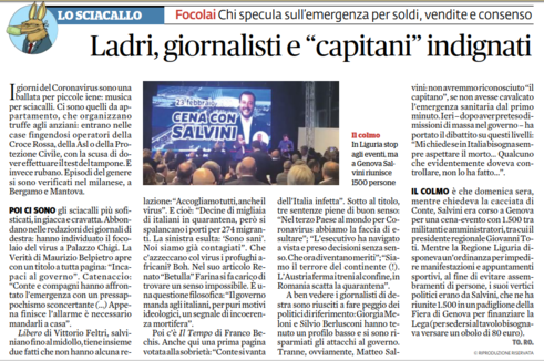 Mentre lo #Sciacallo Salvini individua il paziente zero a Palazzo Chigi cavalcando fin da subito la paura #Coronavirus a scopi elettorali, il Capitano fa una cena di finanziamento della Lega in Liguria riunendo 1500 persone.