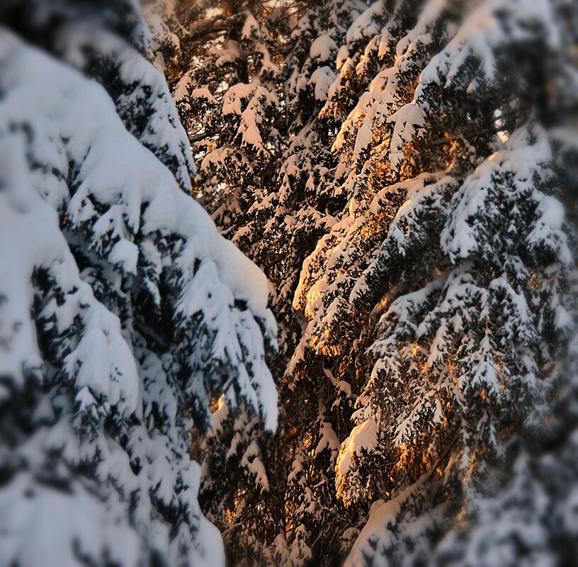 glimpsed through snow-laden branches,