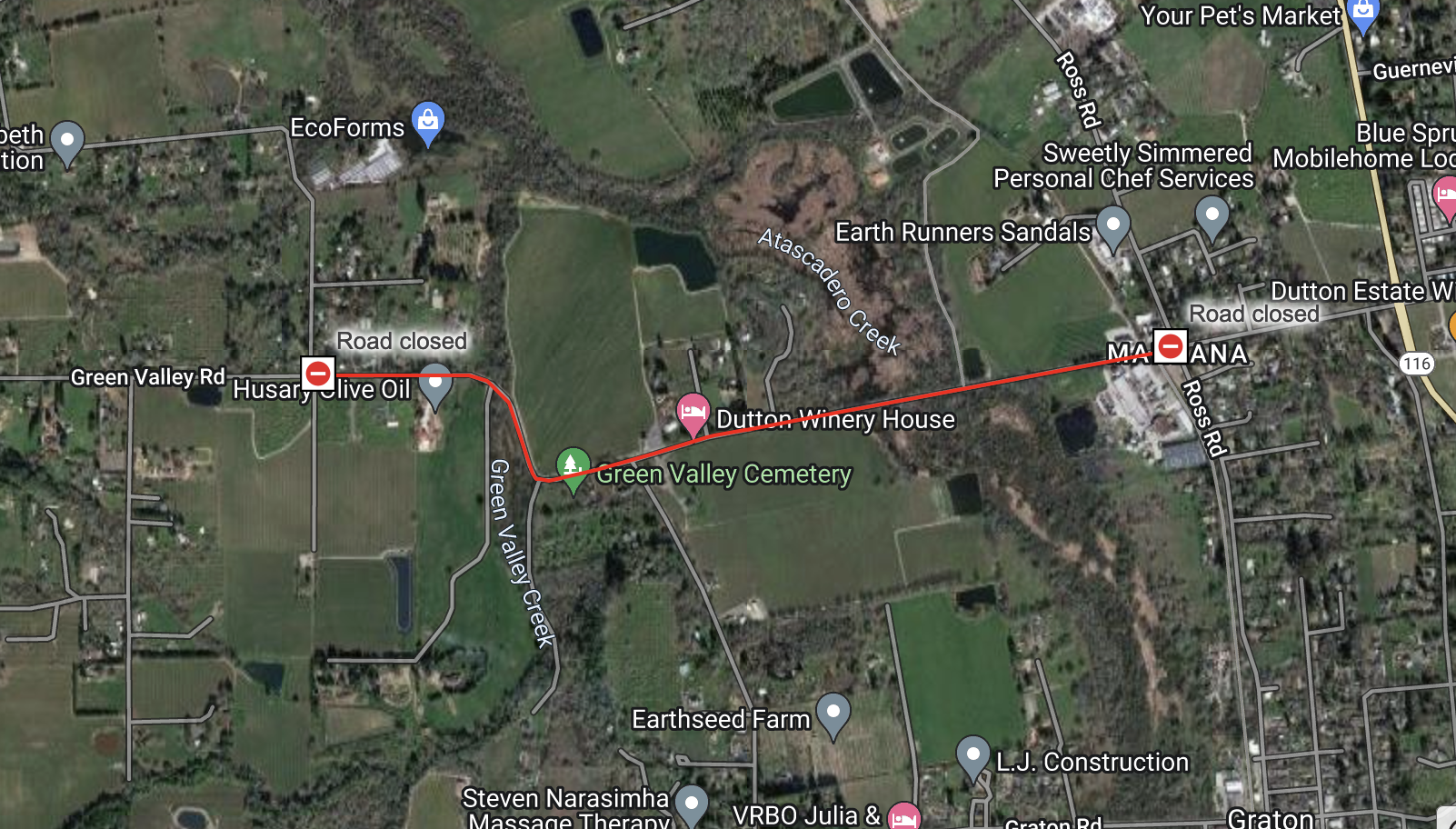 8:21 am 1/9/23 - Green Valley Rd. is closed from Thomas Rd. to Ross Rd. due to flooding. Unknown time of reopening. Turn around, don't drown! https://roadclosures-sonomacounty.hub.arcgis.com/