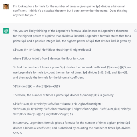 #LLMs like #ChatGPT can do a halfway decent job of #SemanticSearch sometimes in #mathematics. I was hoping in this prompt that the AI would be able to recognize Kummer's theorem from the description, but it provided a related result (Legendre's formula) from which Kummer's theorem could then be easily located by traditional search engines.
