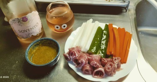#meal #VegetableStick #prosciutto #SparklingWineRose #dragonquest #SheSlime #dinner