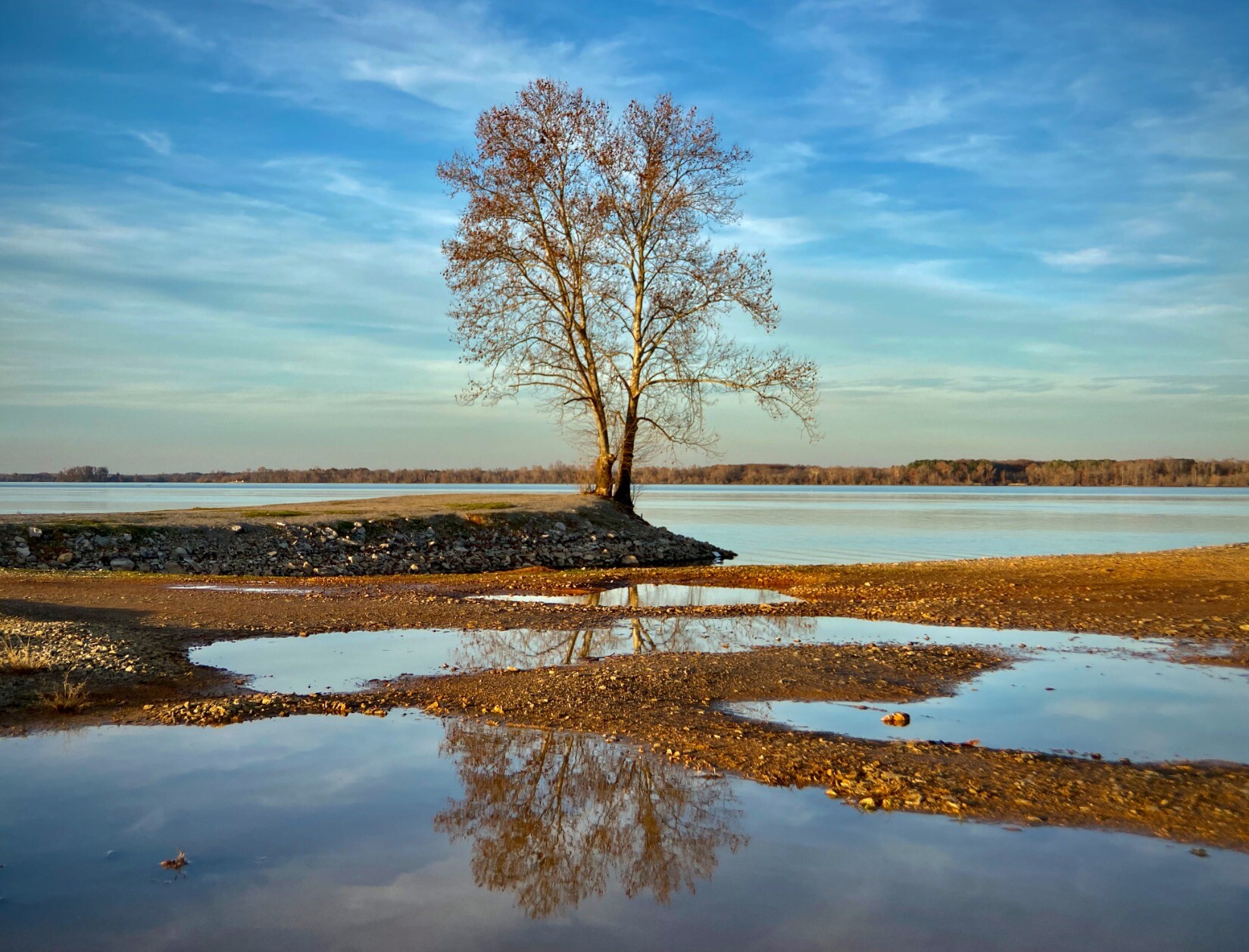 The tree at the end of the world. At Ingalls Harbor in Decatur, Alabama, this sycamore tree commands the shoreline of the Tennessee River. It had rained recently and puddles mirrored the sky and tree. If you bent low to the ground you could see their reflections. I shot this with an iPhone 11 using a 2x tele lens from Moment.