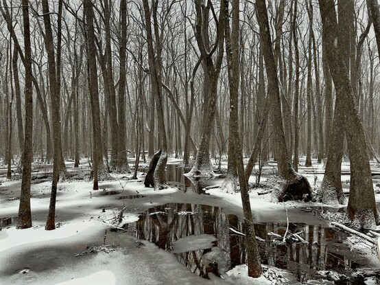We deepened the snowy silence by taking the path through tupelo trees at the Beaverdam Boardwalk, a few miles from Madison, Alabama.
