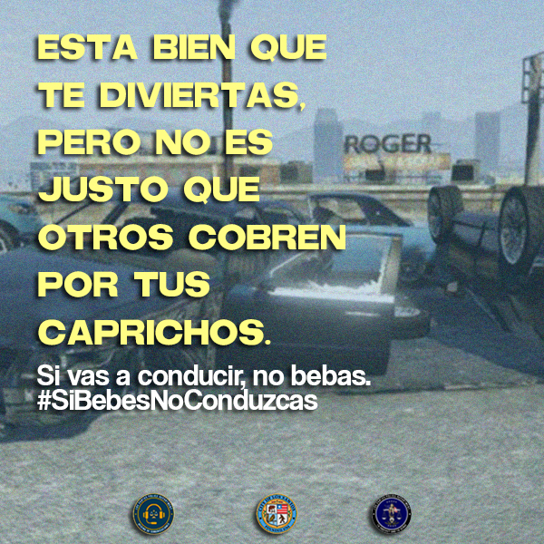 El Departamento de Policía de Los Santos desea recordar a todos los conductores la importancia de no manejar bajo los efectos del alcohol. Conducir en estado de embriaguez es peligroso y puede tener consecuencias graves para usted y para otros en la carretera. Si ha bebido, busque alternativas seguras como pedir un taxi, utilizar transporte público o pedirle a un amigo sobrio que lo lleve a casa.