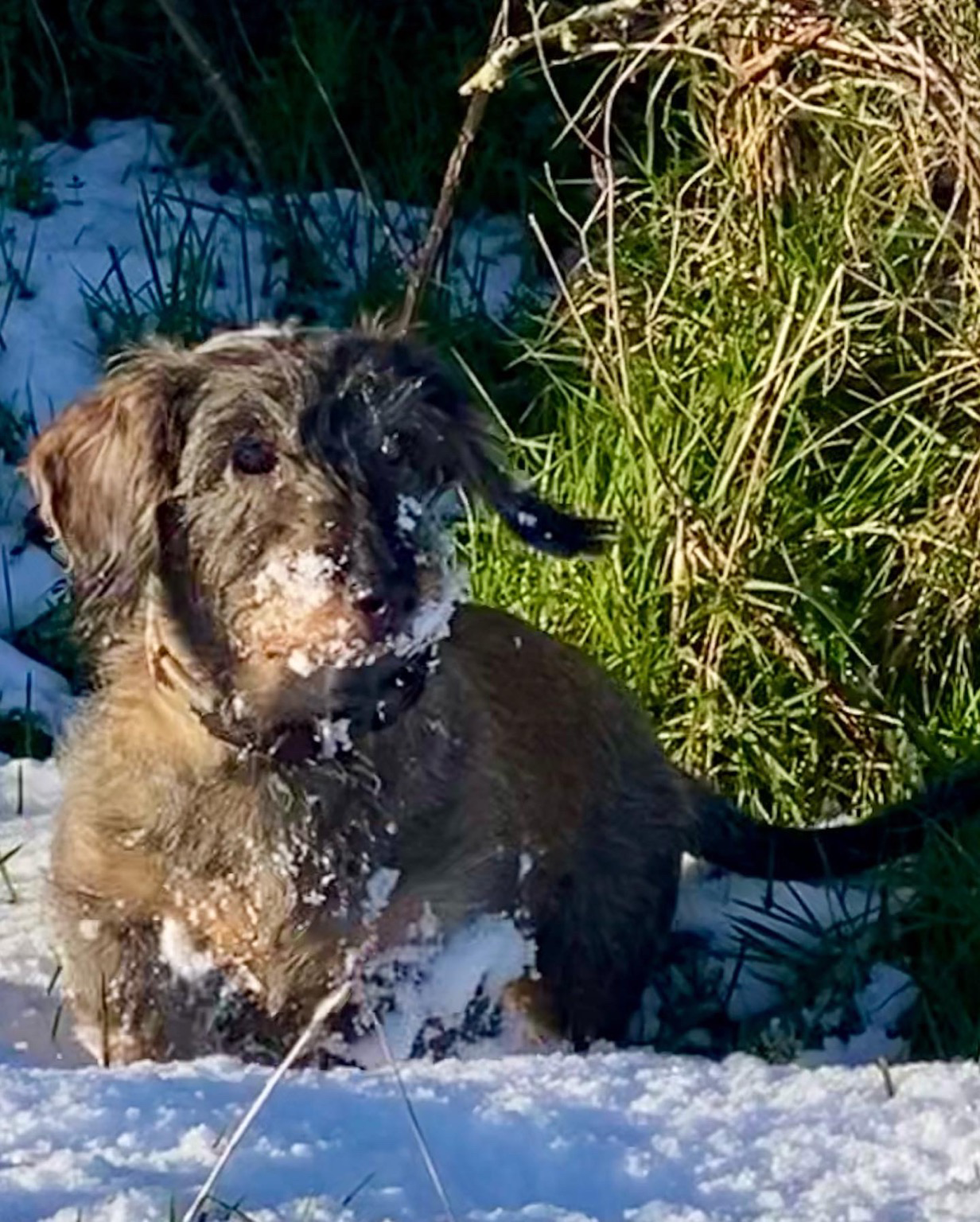 Signing off for Yule, dear #fediverse. May all your days be merry, blessed and bright, and filled with love and peace, especially those who find this time of year hard, sad or lonely. Sending all of you a big hug. And here’s my 2022 Cheerful Dachshund in the snow for your viewing pleasure.