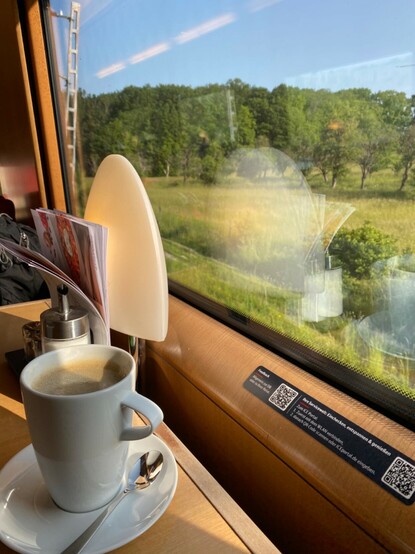 Der Zug zuckelt in Deutschlandgeschwindigkeit (da scheint es bei der Bahn doch irgendsoein #Tempolimit zu geben… 😯) aufs Schönste durch die Gegend, der Speisewagen war leer, als erstmal ☕️ 2.0.