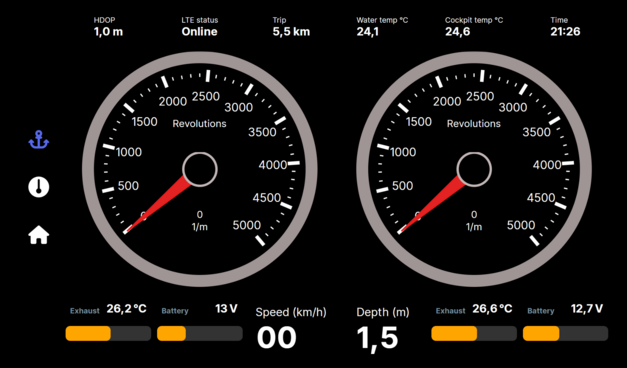 #Skipper this is how my dashboard looks like for my boat. All done in about 30 minutes tinkering with the app. Now , I need to fix few more bugs and add new on boarding experience with better UI that will guide user for initial setup, find Signal K server, configure access token, offer some starting page templates. Powered by @avaloniaui build with #dotnet connected to #SignalK