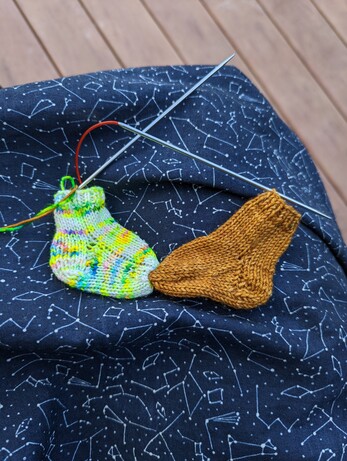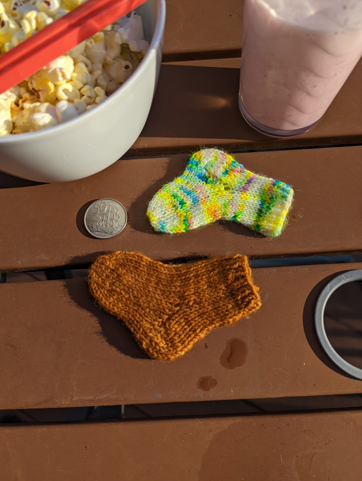 Update on my tiny technique experiment socks: they're nearly ready to be separated!