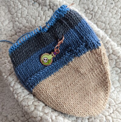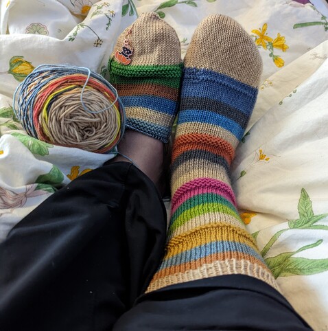 I've always wondered if I'd be able to feel woven patches on my socks, and the answer is "Yes but only for a few minutes until the fibers flatten." I got two outright holes closed up and put these back into use today! Of course now that I'm looking at the photo I'm thinking maybe there's a thin spot that needs duplicate stitch too...