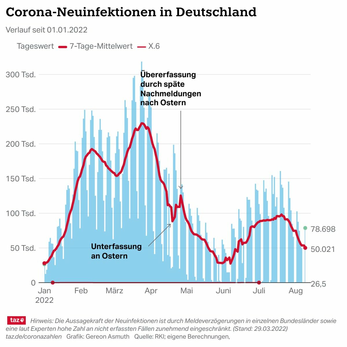 Der Tageswert von 78.698 neu registrierten #Corona-Infektionen lässt den 7-Tage-Mittelwert um weitere 3.429 auf 50.021 fallen. Er ist damit seit dem Höchststand der #Sommerwelle am 20.7 mittlerweile um fast die Hälfte gesunken. (2/x)
