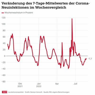 Der 7-Tage-Mittelwert der #Corona-Neuinfektionen liegt am Dienstag 7,7% niedriger als vor 1 Woche. Wie die Grafik veranschaulicht, hat sich der Rückgang der #Sommerwelle in den letzten Wochen deutlich verlangsamt. (4/x)
