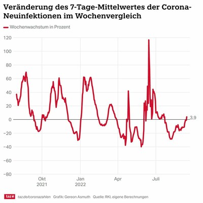 Deutlicher wird die Trendwende im Wochenvergleich. Der 7-Tage-Mittelwert der neu registrierten #Corona-Infektionen liegt am Dienstag 3,95% höher als vor 1 Woche. Das ist der erste Wochenanstieg seit 22. Juli. Damals erreichte die #Sommerwelle ihren Höchststand. (3/x)