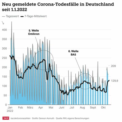 Der Tageswert von 209 neu registrierten #Corona-Toten ist der zweithöchsten der letzten 2 Monate. Er lässt den 7-Tage-Mittelwert auf 129,9 steigen. Das ist mehr als der Höchststand der #Sommerwelle und 38,6% mehr als vor 1 Woche. (10/x)