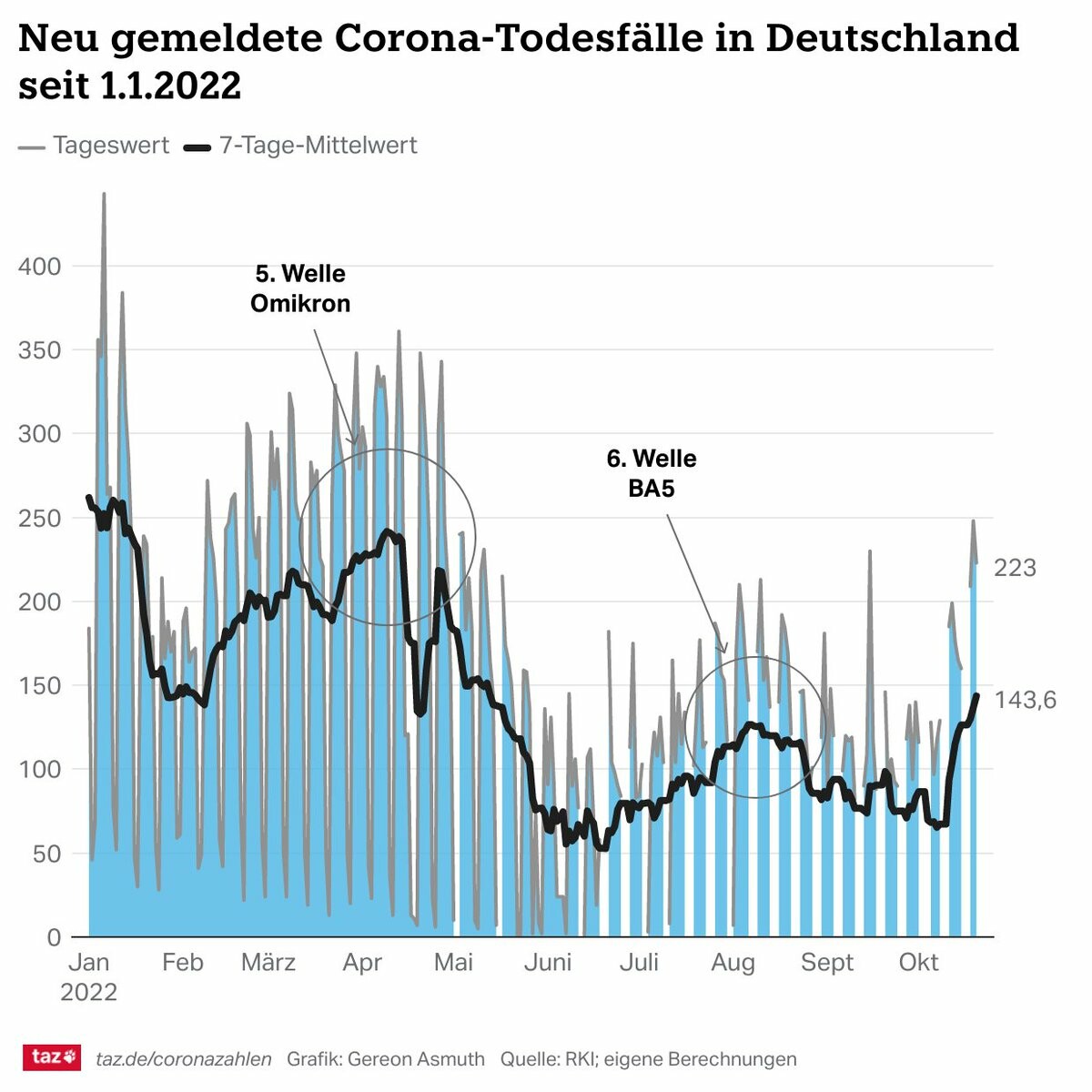 Sehr deutlich gestiegen ist die Zahl der #Corona-Toten. Der Tageswert von 223 weiteren Opfern lässt den 7-Tage-Mittelwert auf 143,6 steigen. Das ist der höchste Wert seit Mitte Mai und übertrifft damit den Höchststand der #Sommerwelle. (10/x)