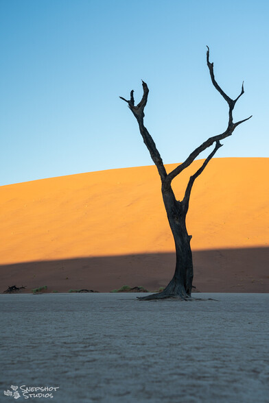 Here are my personal favorite photos from Deadvlei. One with the direction of the sun and interesting lines from the trees and branches. The other one is against the sun with shadows and a sunstar.