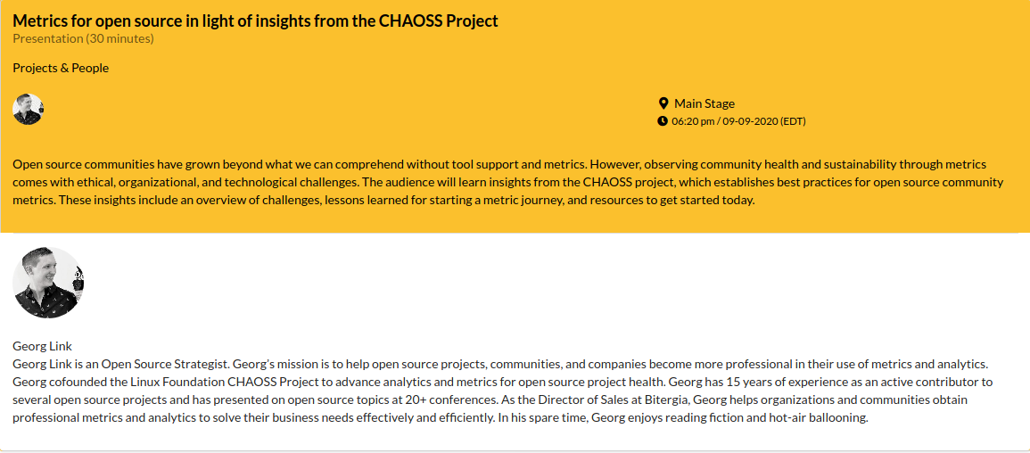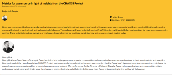 Bitergian and @CHAOSSproj co-founder @GeorgLink will be talking about "Metrics for open source in light of insights from the CHAOSS Project" tomorrow at #StateOfTheSource Summit 🌏 Don't miss it!