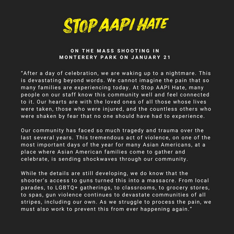 Our statement on the devastating events in Monterey Park. #StopAAPIHate