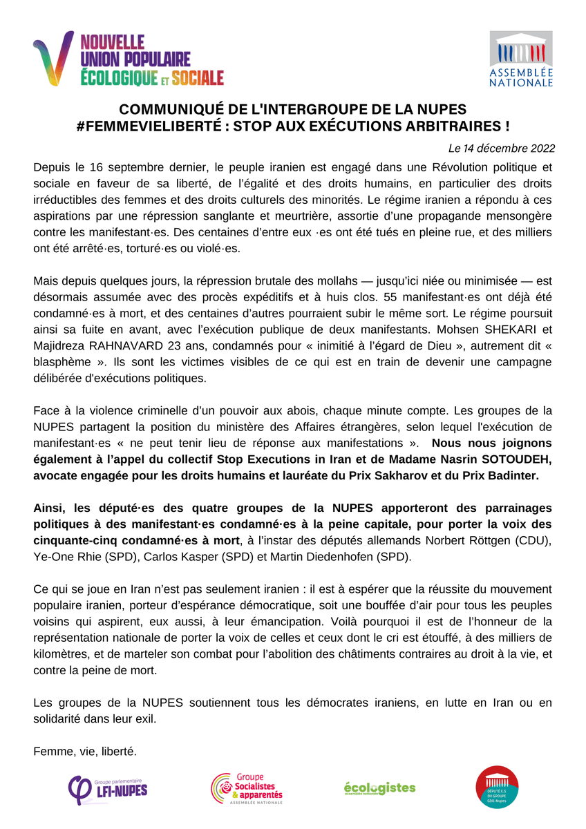 Les groupes de la @NUPES_2022_@twitter.com se joignent à #StopExecutionsInIran et @NasrinSotoudeh@twitter.com, contre les condamnations à mort de manifestant·es en Iran.