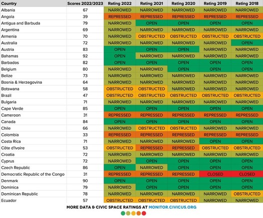 Current and previous ratings for the 120 countries invited to the #SummitForDemocracy 🔴🟢🟡: http://web.civicus.org/CountryRatings