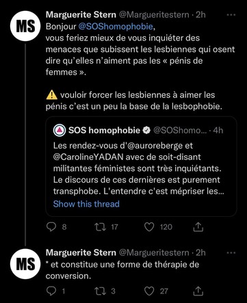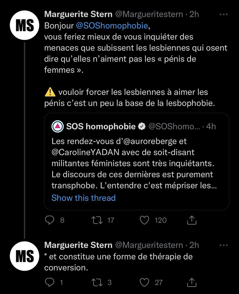 Par respect pour les victimes de #ThérapiesDeConversion réunies ici & dans le monde, nous demandons à @Margueritestern@twitter.com de cesser d’instrumentaliser le sujet des thérapies de conversion pour nourrir ses discours idéologiques transphobes. C’est #malhonnête & #nauséabond…1/3