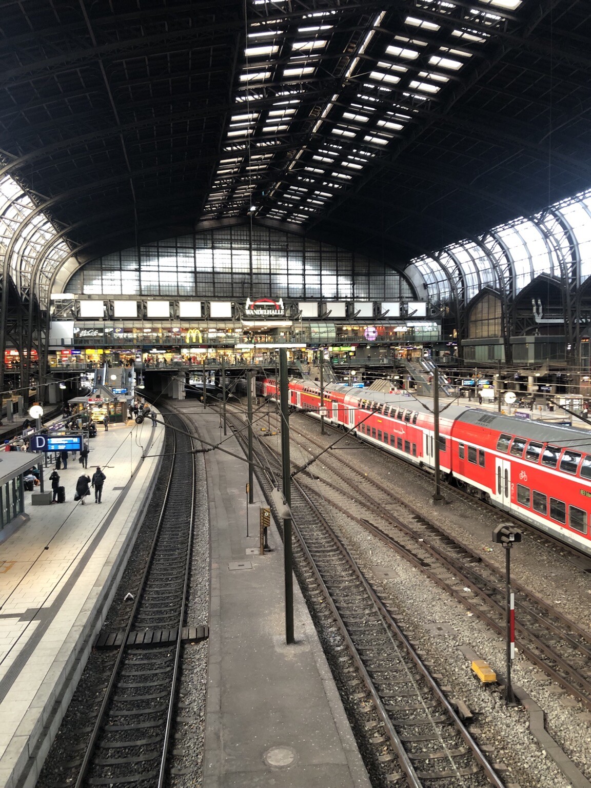 Mit Spaziergang, an den Bahnsteigen entlang, sich die Zeit verkürzen, trotz der leichten Angespanntheit. Mein Anschluss in HH hat tatsächlich nun doch (war schon in Muc angekündigt) „aufgrund eines vorausfahrenden verspätetet Zug“ nahezu 60 (!) Min. Verspätung. Großes Seufz. Atmen. Da schrumpft mein #Bahn- Puffer dahin. (Rechne ohnehin schon immer zwei bis drei Stunden ein für „Notfälle“) Ruhe bewahren.