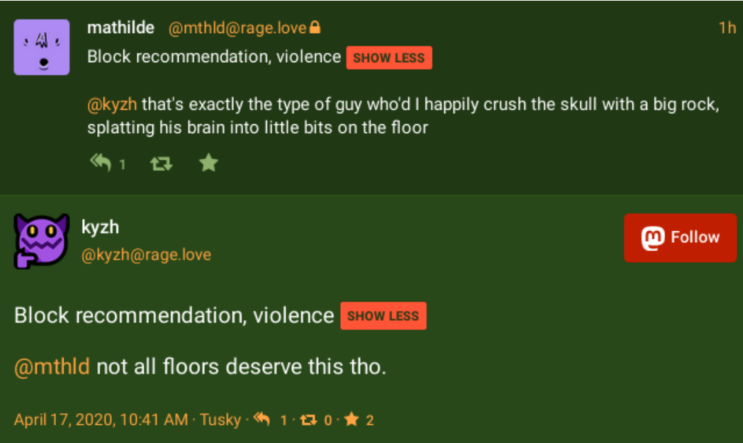 Like seriously, *someone* has to keep an eye on people who insist on making such graphic and violent threats! They could hurt someone! We can't have a fediverse where marginalized people can be exposed to toxicity like this.