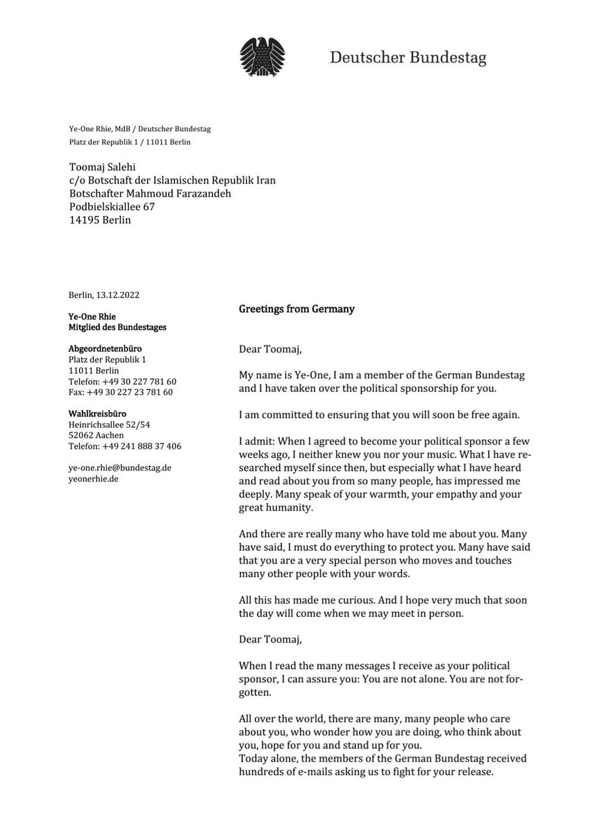"#DearToomaj..." I wrote to #ToomajSalehi in prison. To raise the chances, I sent 4 letters to Dastgerd-Prison and 1 to @IraninBerlin@twitter.com demanding a response from Toomaj. Rule of law means prisoners are allowed to receive and write letters. Let's see how it is in IRI. ⬇️
