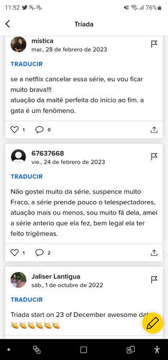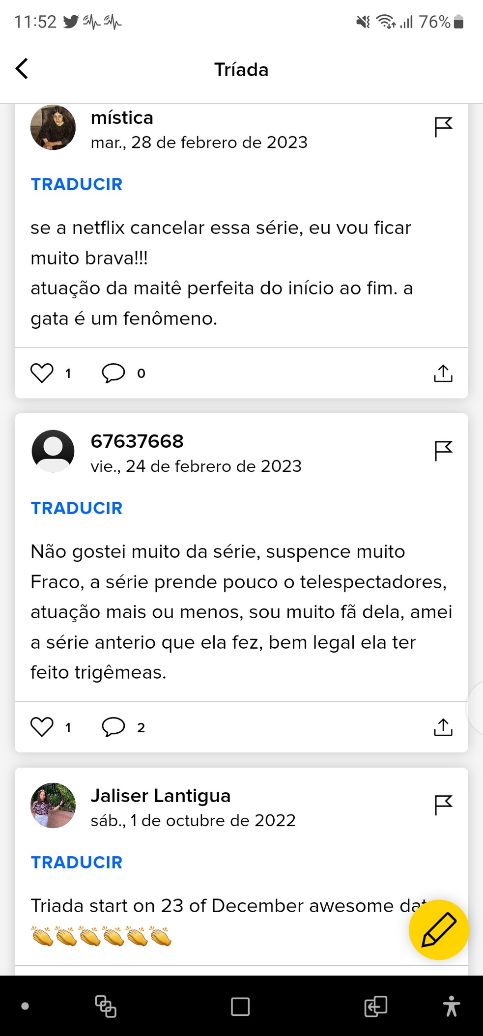 Estoy viendo #triada #triptych y en #TVTime los comentarios y favs de la serie son de brasileños que dicen la amaron 😂😂😂