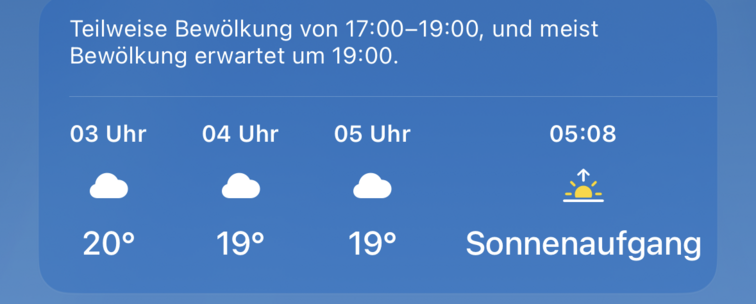 Die Umstellung der Wetterlage macht sich durch die feuchtere/schwülere Luft + mehr Bewölkung bemerkbar. Nachts hat es dadurch kaum abgekühlt.