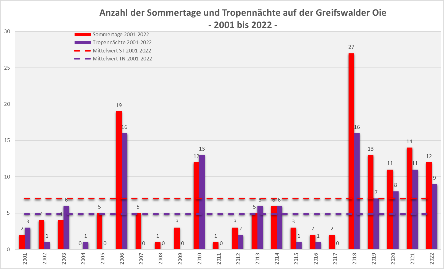Rekord stammt aus den heißen Sommern 2006 und 2018 mit sehr hohen Wassertemp., jeweils 16 Tropennächte auf der Oie.