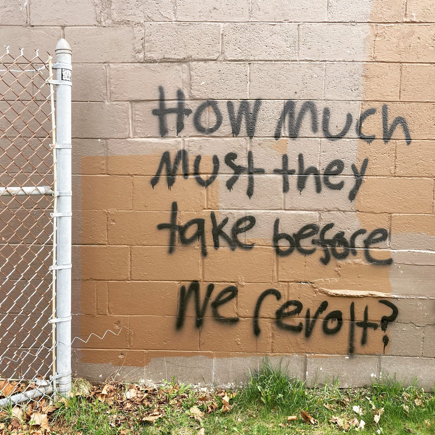 (photo: concrete-brick wall painted brown with the words “How much must they take before we revolt?” spray painted in black on it)