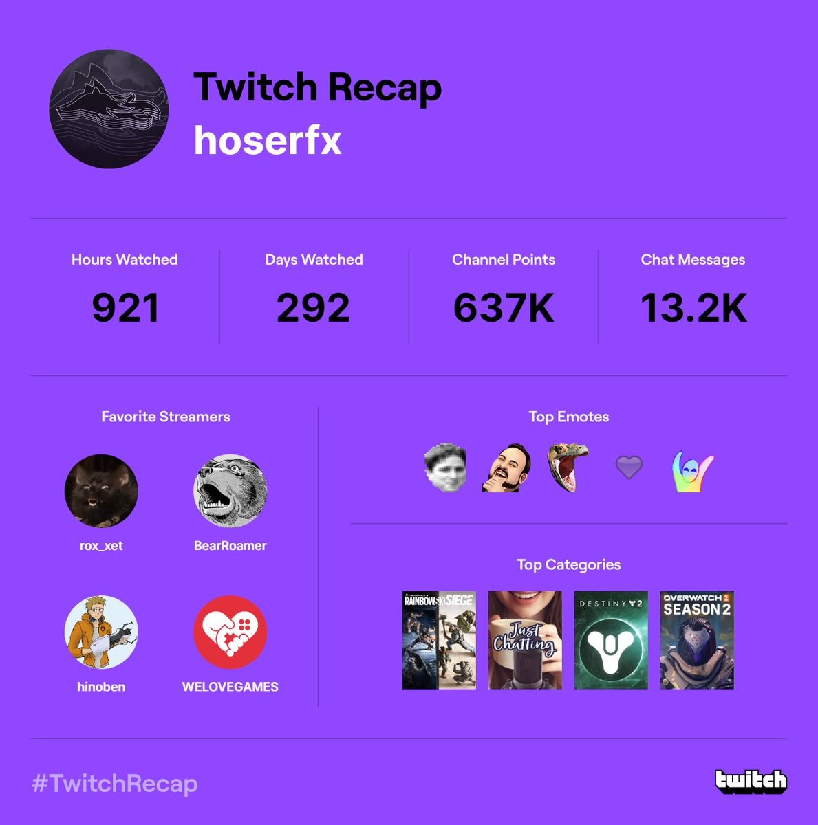 Heh, kinda goofy stats on my #TwitchRecap :pika: Pretty sure none of fave streamers are here on Mastodon yet, but they've been solid all year - ElSock , ChefJayTay, Vyr1s & cult-movie bestie ShoutFactoryTV. 🤓