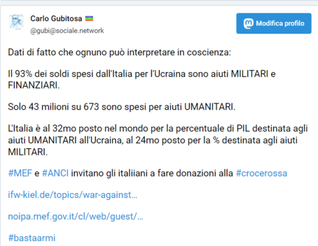 @giacomo_stingo è falso che gli stati abbiano aiutato molto, se è vero come è vero che #WFP, #UNHCR, #CRI e #OMS stano col cappello in mano a chiedere l'elemosina per gli Ucraini. L'Italia ha speso per le armi il 93% della somma stanziata per l'Ucraina. Non so come si fermano gli imperialismi, ma so che non si fermano con le armi e che non c'è da fermare solo quello russo.