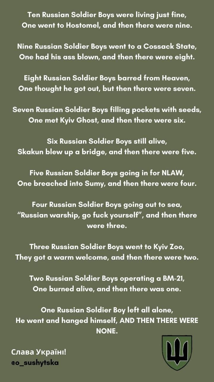 To our 13 warriors on Zmiyiny (Serpent) island during the first day of attack, who took the martyr death, but did not yield to Russian warship. Remember their last radio transmission: “Russian warship, GO FUCK YOURSELF!”. Glory to the heroes! #UkraineWillOvercome