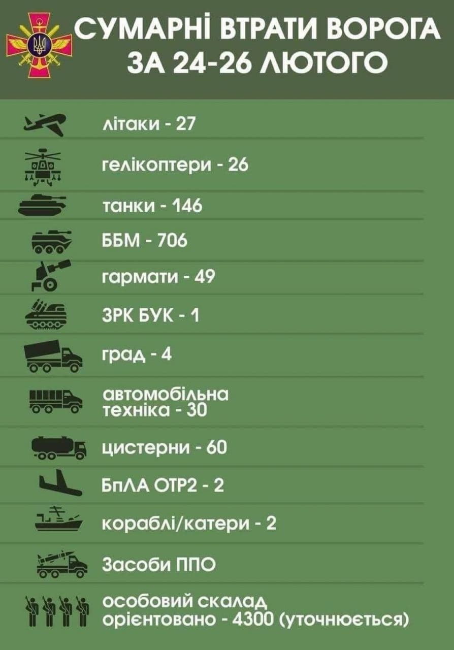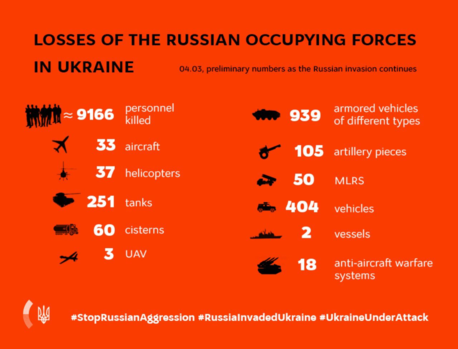 "Russia is losing men and equipment fast in Ukraine, and keep in mind that Russia has not yet made serious efforts to enter the big cities with regular troops. Such an adventure would multiply the number of casualties", - Anders Östlund (https://twitter.com/andersostlund).